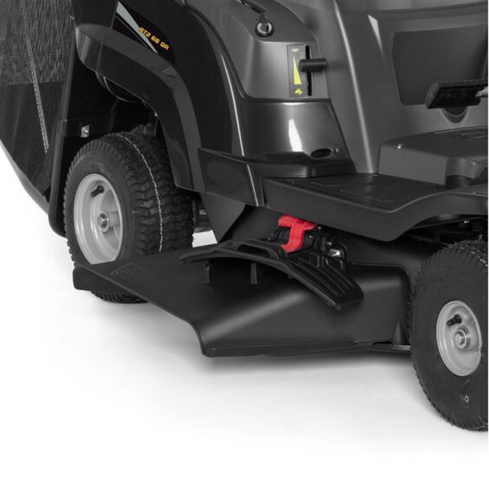 Het maaisysteem is uitgerust met een eenbladig maaidek met een maaibreedte van 66 cm, die centraal in 5 standen kan worden versteld van 30 mm tot 64 mm. Hierdoor kan de zitmaaier voor elke situatie met de juiste instelling werken. Het 2in1 systeem biedt ook de mogelijkheid om te schakelen tussen zij-uitworp en grasopvang.