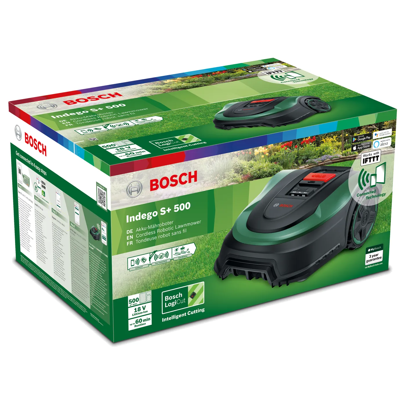 De BorderCut-functie zorgt dat de rand van jouw gazon aan het begin van elke maaibeurt wordt gemaaid. Met de functie MultiArea kunnen maximaal drie extra gazongedeeltes worden gemaaid (bij elkaar in totaal 500 m²). Door de SmartMoving-functie houdt de robotmaaier rekening met de weersomstandigheden en slaat hij een maaibeurt over als het weer te slecht is. Door zijn formaat is de Bosch robotmaaier Indego S+ 500 ook in staat om onder en rondom tuinstoelen te maaien.