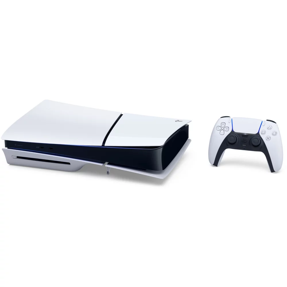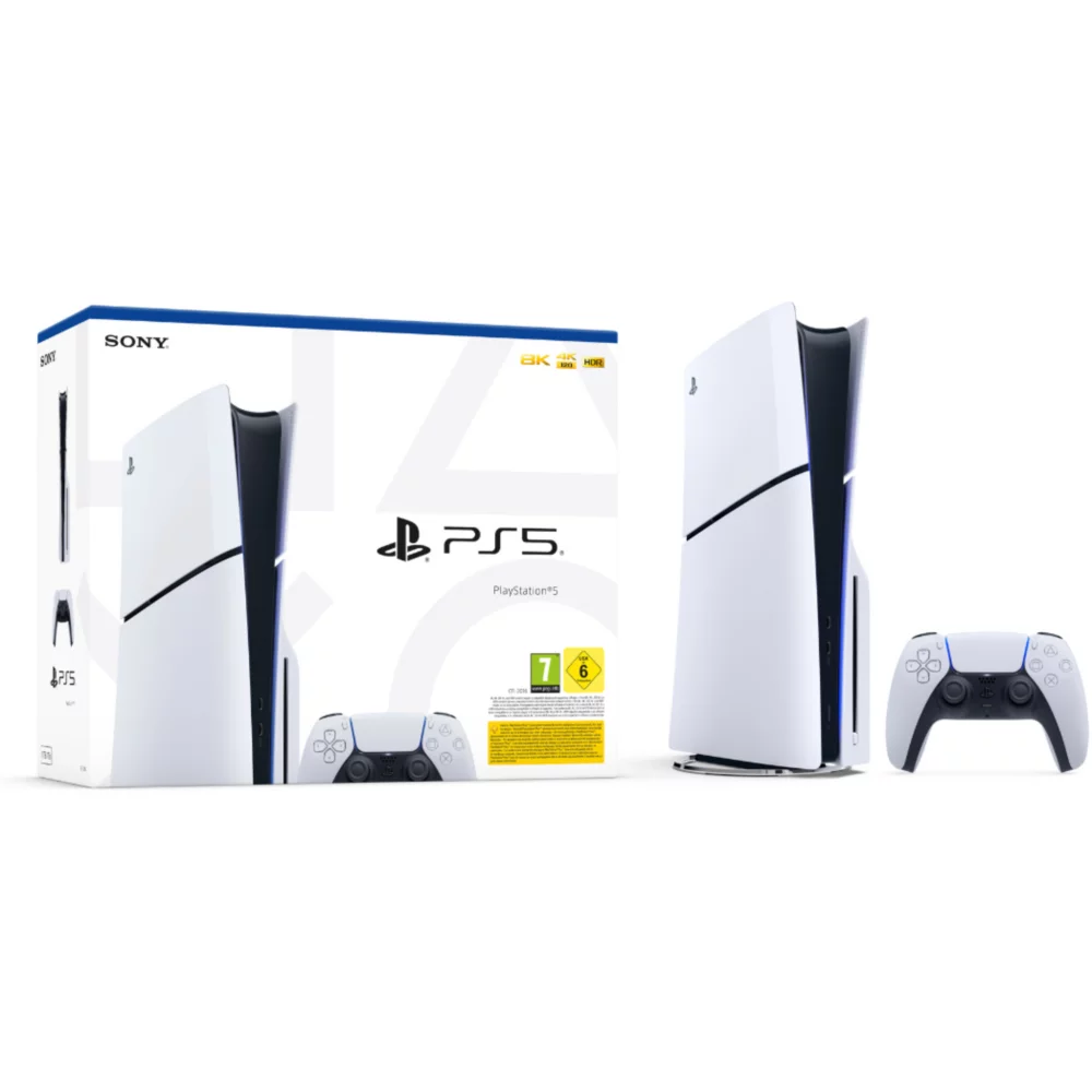 PlayStation 5 Slim, draadloze controller, 1 TB SSD, schijfstation, 2 horizontale standaardvoeten, HDMI-kabel, AC-netsnoer, USB-kabel, gedrukt materiaal, ASTRO’s PLAYROOM (vooraf geïnstalleerde game) |
